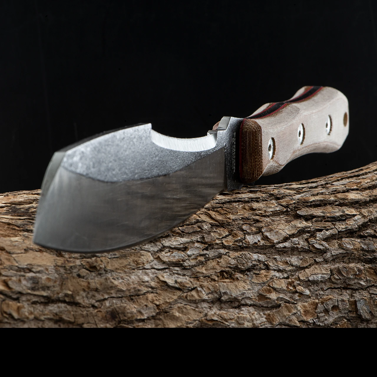 The Condor Mountain Pass Surveyor Knife features a stainless steel blade with a two-tone Condor Classic finish. It has a curved Wharcliff shape with a false edge running half the length of the blade. Despite the lack of ultra sharp edge it does, however, have enough “bite” to debark branches or get a spark out of a fire rod. The handle is made up of two slabs of tan canvas micarta with red liners. This extremely practical tool is supplied with a leather sheath.