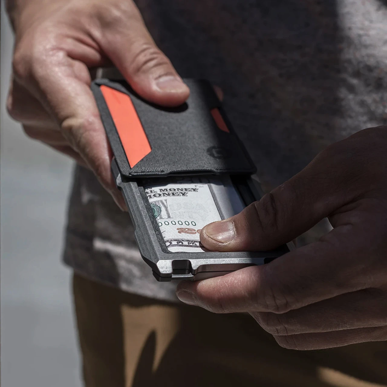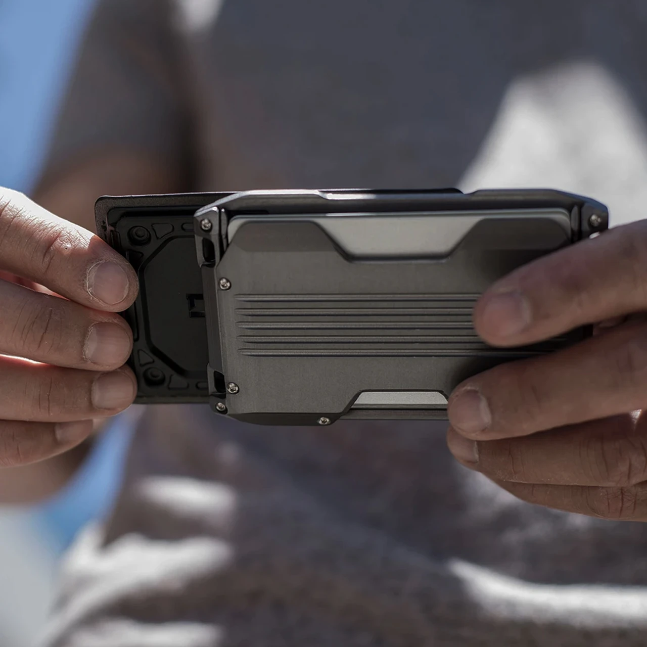 The chassis of the Dango A10 Adapt Single Pocket Wallet is made of machined 6061 aerospace grade aluminium and anodized to perfection. The A10 is equipped with Dango’s popular and unique patent pending quick release rail mechanism on both sides of the wallet that allows easy access to cards while keeping them securely in place. On one side of the chassis is a horizontal cavity holding up to 4 cards that is protected by a removable aluminium RFID plate. On the other side is a single card, vertical oriented cavity meant for displaying identification, badges and any cards that needs scanning; perfect for accessing secured buildings and boarding public transportation.