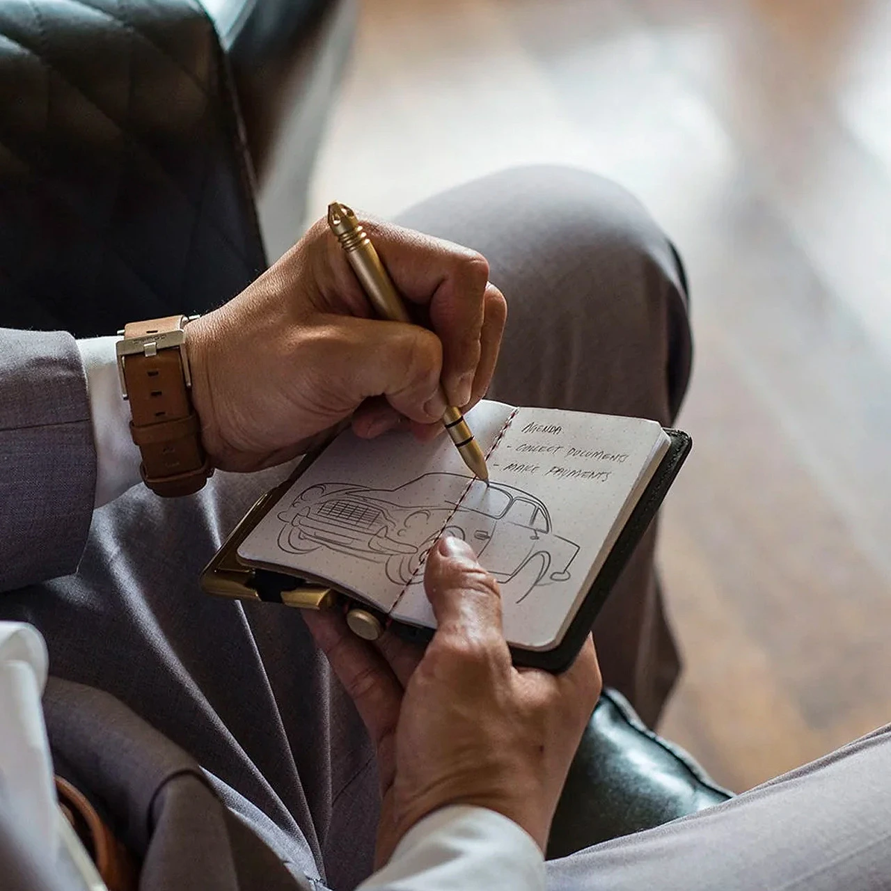 A Hero has his/her agenda dialled at all times. There is no better way to do that with a Dango D007 Pen Wallet. Inspired by James Bond, Dango products has released yet another “D007” edition wallet – this time with polished gold aluminum, a plush jet black leather bifold pen pocket and an exclusive polished gold pen along with Dango’s classic P01 Notes. Introducing the D007 Pen Wallet.