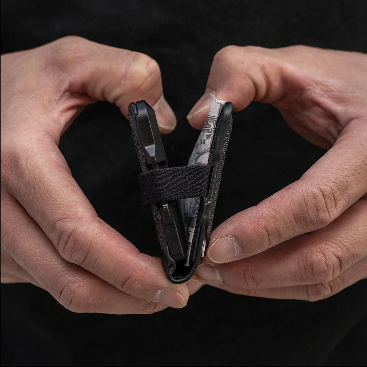 • Rail system with bifold 3-pocket design to hold up to 14 cards. Integrated elastic band to hold additional cash and cards or to enclose the wallet.
