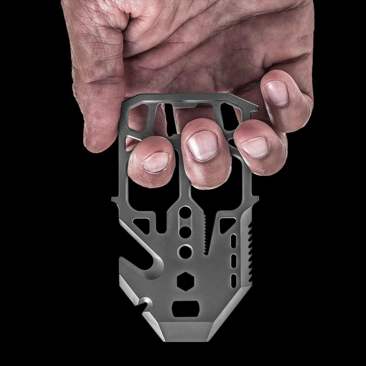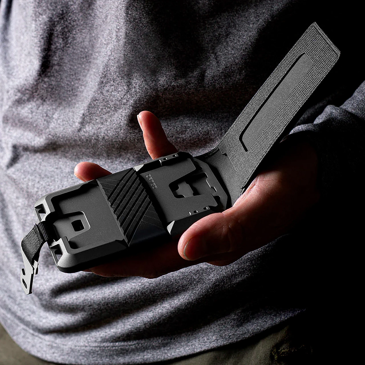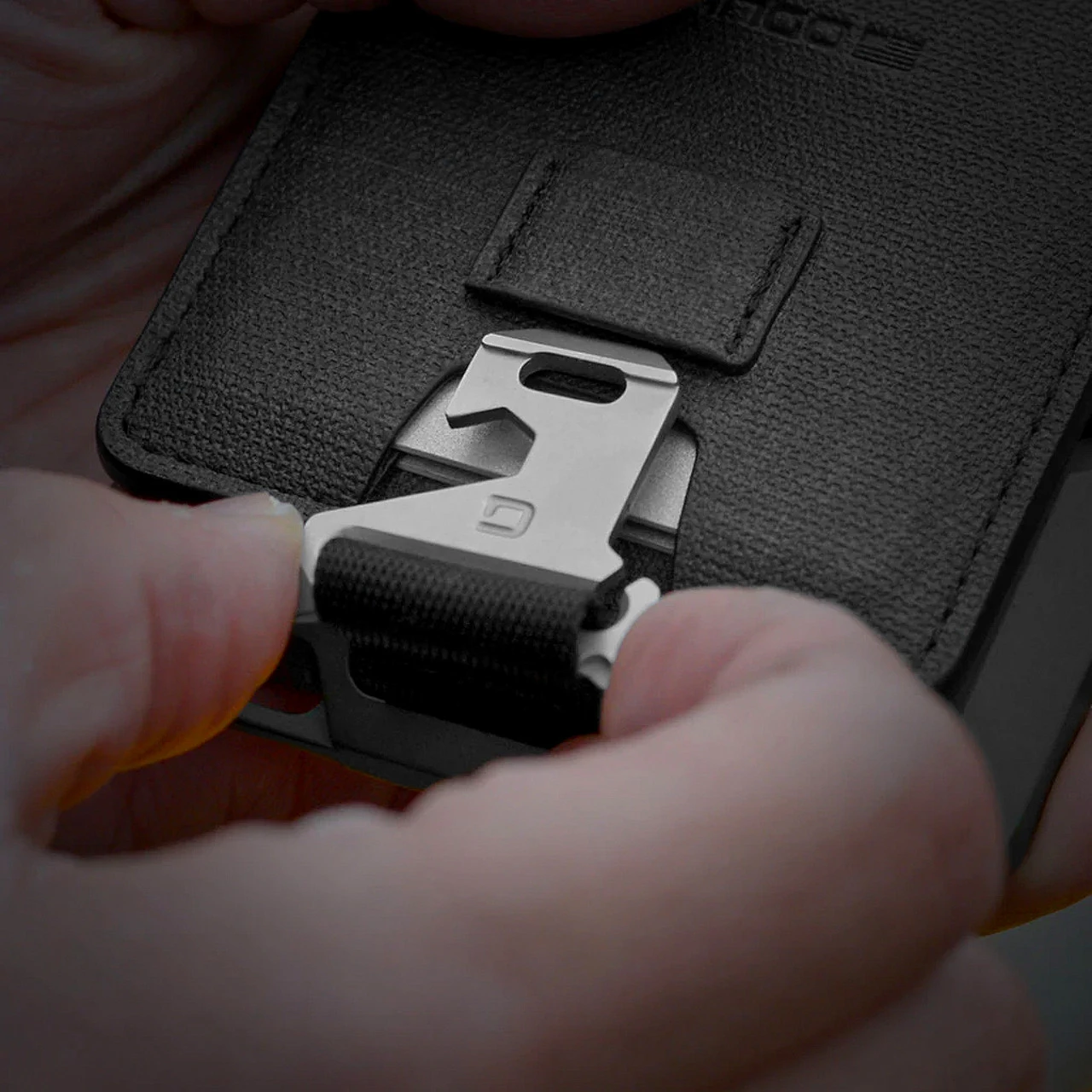 The M1 Spec-Ops Bifold Pocket variant comes with its pairing high carbon, heat treated MT04 Multi-Tool which has over 10 functions which are specifically designed to respond to emergency situations. The functions of the multi-tool include: a seat belt cutter, serrated/sharpened edges, chisel, 2 paracord tensioners, an O2 oxygen wrench, nail pryer, standard 1/4” inch hex wrench, and of course, a bottle opener. The MT04 Multi-Tool slides into the metal cavity where the cards sit and is nested securely onto the safety locks on the chassis.