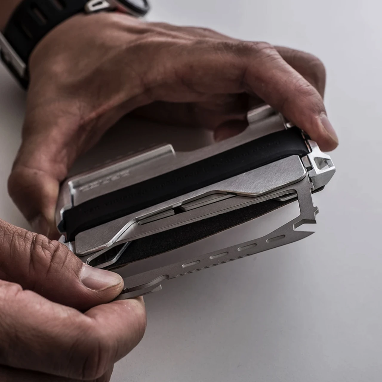 When engaged, the multi-tool can nest securely into the safety locks built into the wallet chassis- allowing for easy sawing, cutting and protection. Common tools are built in: hexes, paracord cutter, nail pryer, a serrated/sharpened edge and even a phone stand. Dango thought of everything and reckon you’ll be pleased with all of the functions built into such a small package.Â