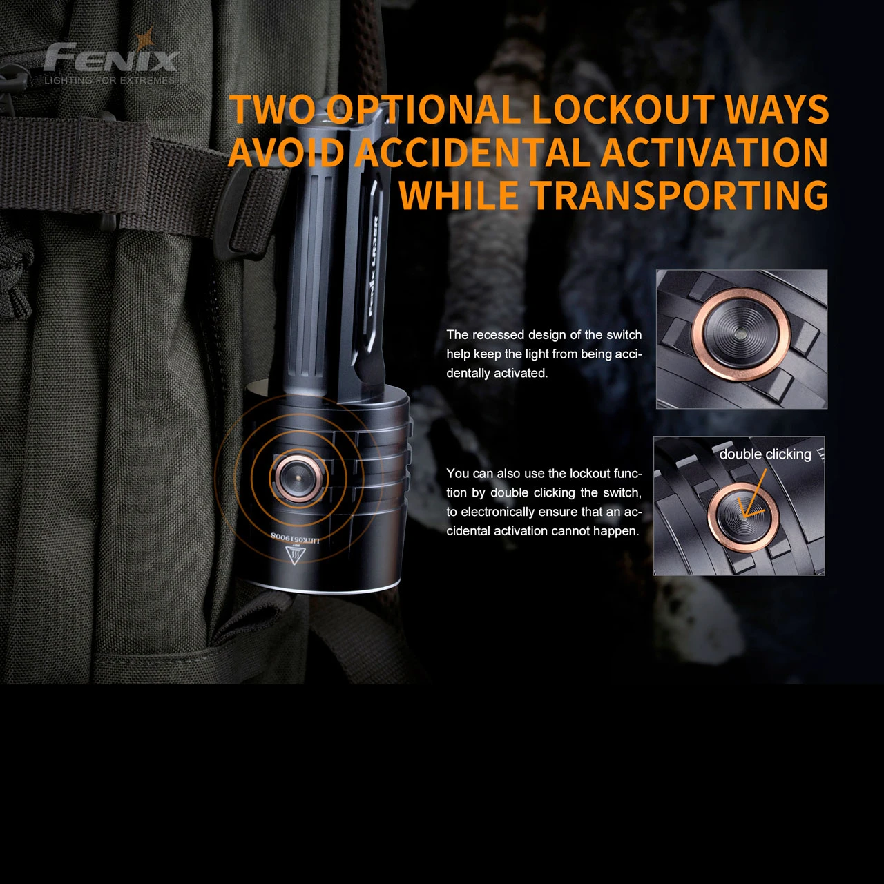 Fenix LR35R searchlight features five brightness levels – 50 / 450 / 1,200 / 3,000 and 10,000 lumens, operated by a single head mounted push button. Over heat protection reduces output until your LR35R torch cools, after which maximum output can be used again.