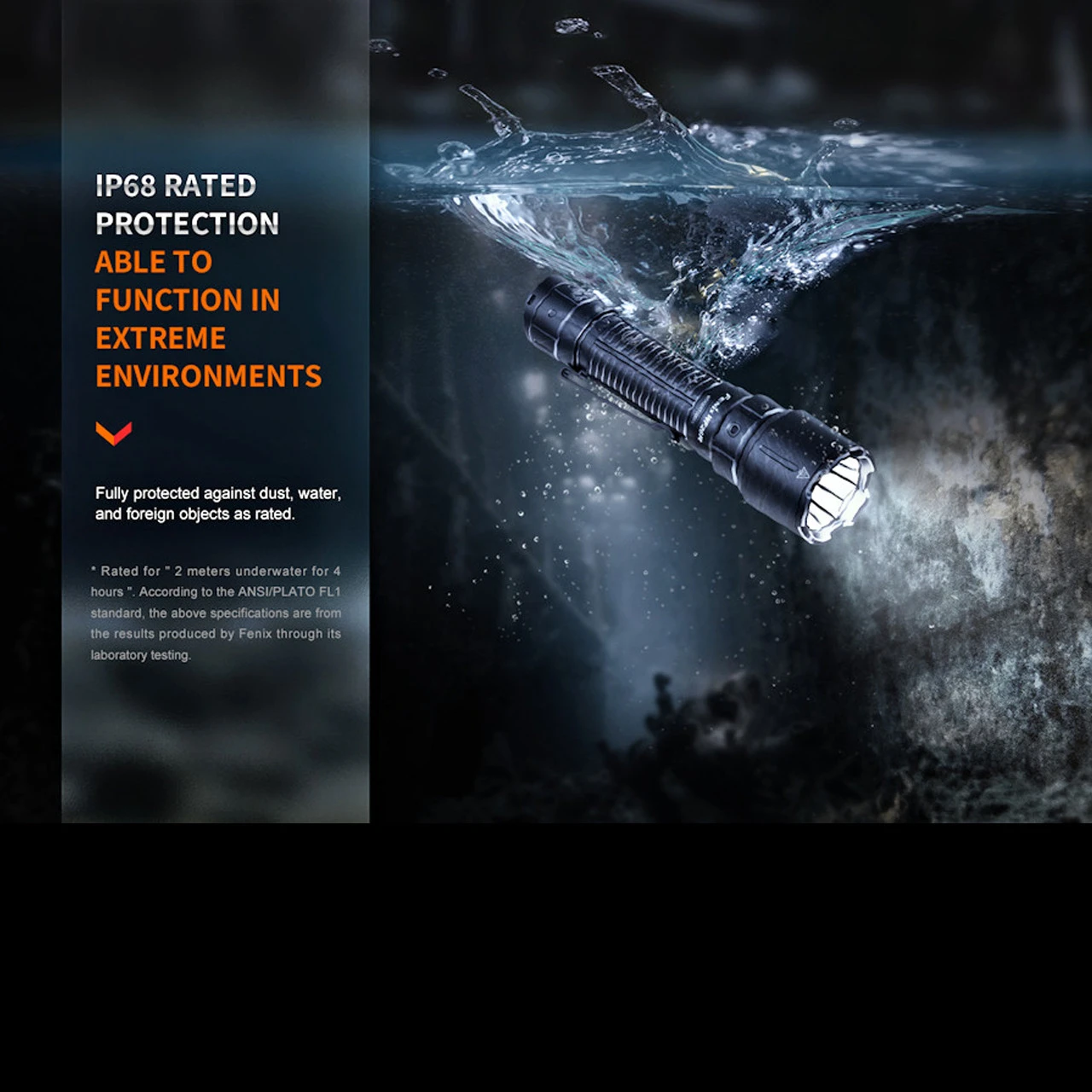 Dual tail cap switches provide convenient one hand operation of all lighting functions including 3000 lumens Instant – Strobe for self protection.