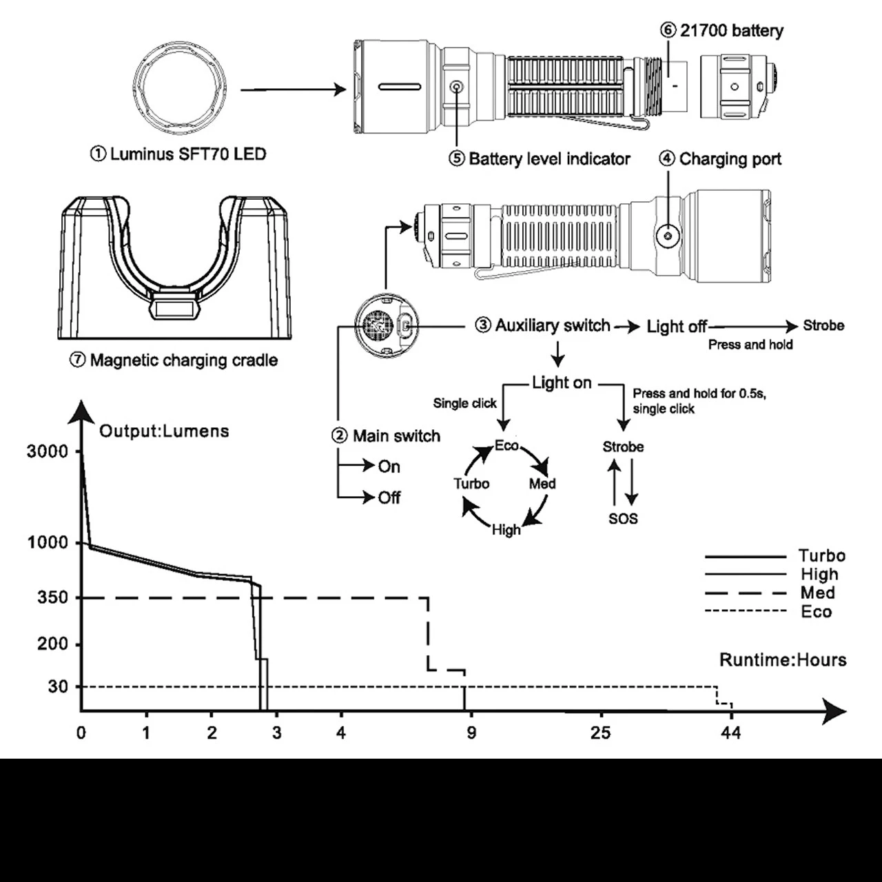 - Turbo: 3000 lumens (2 hours 41 minutes), 450m beam. (Overheat protection steps brightness down gradually to prevent over temperature. Full power can be reset when the torch cools)
