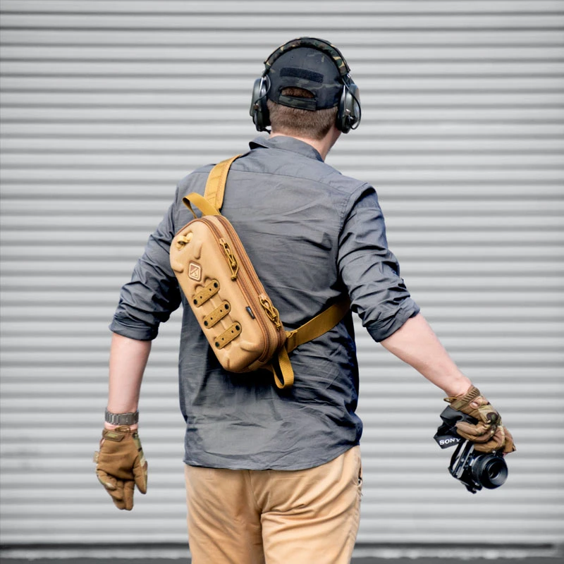 The pack-length is perfect for horizontal waist wear. Light aerated padding is quilted by military modular webbing for adding pouches/tools, etc. to the strap in either wear style. Top/bottom handles aid in pulling around or hanging up.