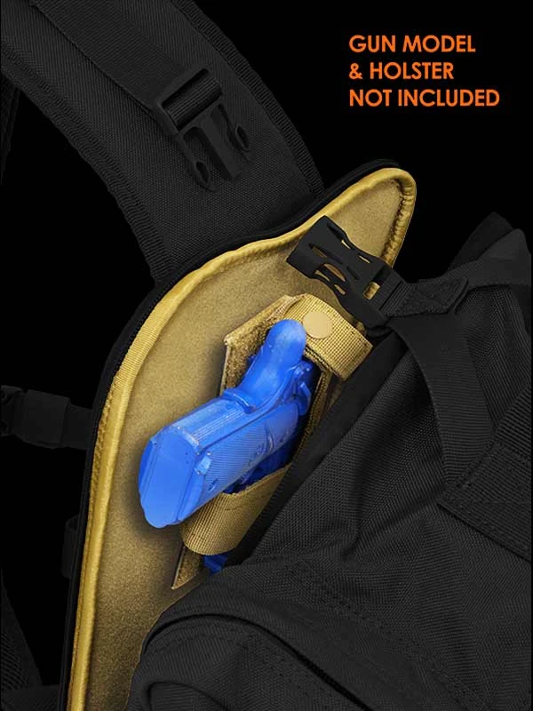 • middle front pocket has velcro field for mounting our popular universal pistol holster (Stickup)