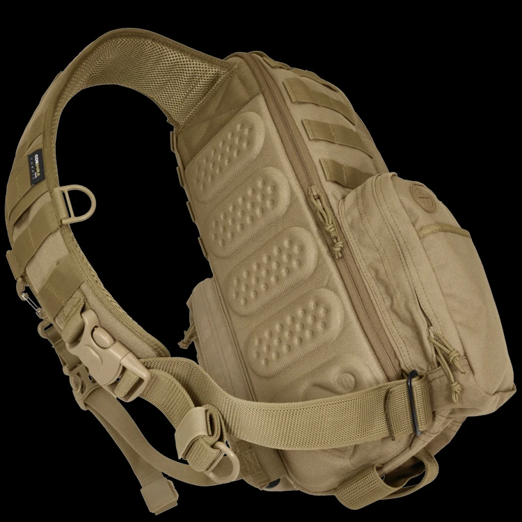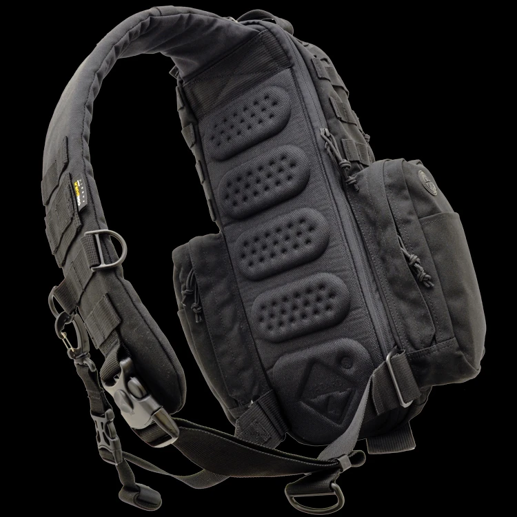 Being jammed in confined spaces for hours is an unfortunate part of the business for many professionals. Whether it’s a military unit in an a.p.c., a pilot in a cockpit, drivers in a HumVee, or a journalist in the back of a goat truck, they all have to bring their gear. And they all may need to ‘relocate’ in a hurry. This is the environment for which the Hazard4 Evac line of sling packs has been geared. They are slim shaped to be easily manoeuvred in crowds, or stored in vehicles/lockers, and are quick to take on or off. They are also ambidextrous, and unlike others in this class, are actually comfortable on the shoulder; The bottom strap clips from either the right or left lower corner and the padded section realigns itself ergonomically in the correct body-hugging direction. The bag can be rotated to the chest for on-the-go access, and all pockets are designed to face the user in this mode on either the right or left side. One-strap-carry also makes shouldering a long-gun comfortable – unlike a backpack.