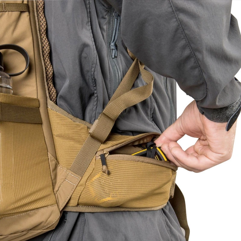 The Summit has two elastic mesh pockets on sides for a water bottle or small jacket, while an elastic mesh beaver tail, placed on the front, can be used to carry helmet or even a larger winter jacket. A comfortable, profiled hip belt has two zippered, mesh pockets. Additionally, thanks to 10mm wide MOLLE Lite webbing on sides you are able to attach some larger MOLLE/PALS compatible pouches.