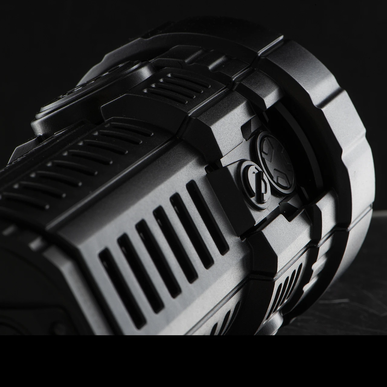 Due to the amount of light that is generated there is also a fair amount of heat that builds up hence the inclusion of fan powered heat shield and two built-in heat release fans, this flashlight can keep the body temperature at about 40 degrees. There is also an Intelligent thermal control. When the flashlight body temperature reaches 50 degreees Cesius,the brightness will decrease to 10,000 lumens in order to ensure safe, comfortable use and prevent discomfort from overheating. When the flashlight body temperature reaches 65 degrees Cesius,the flashlight will not activate turbo. Let it cool and go again!