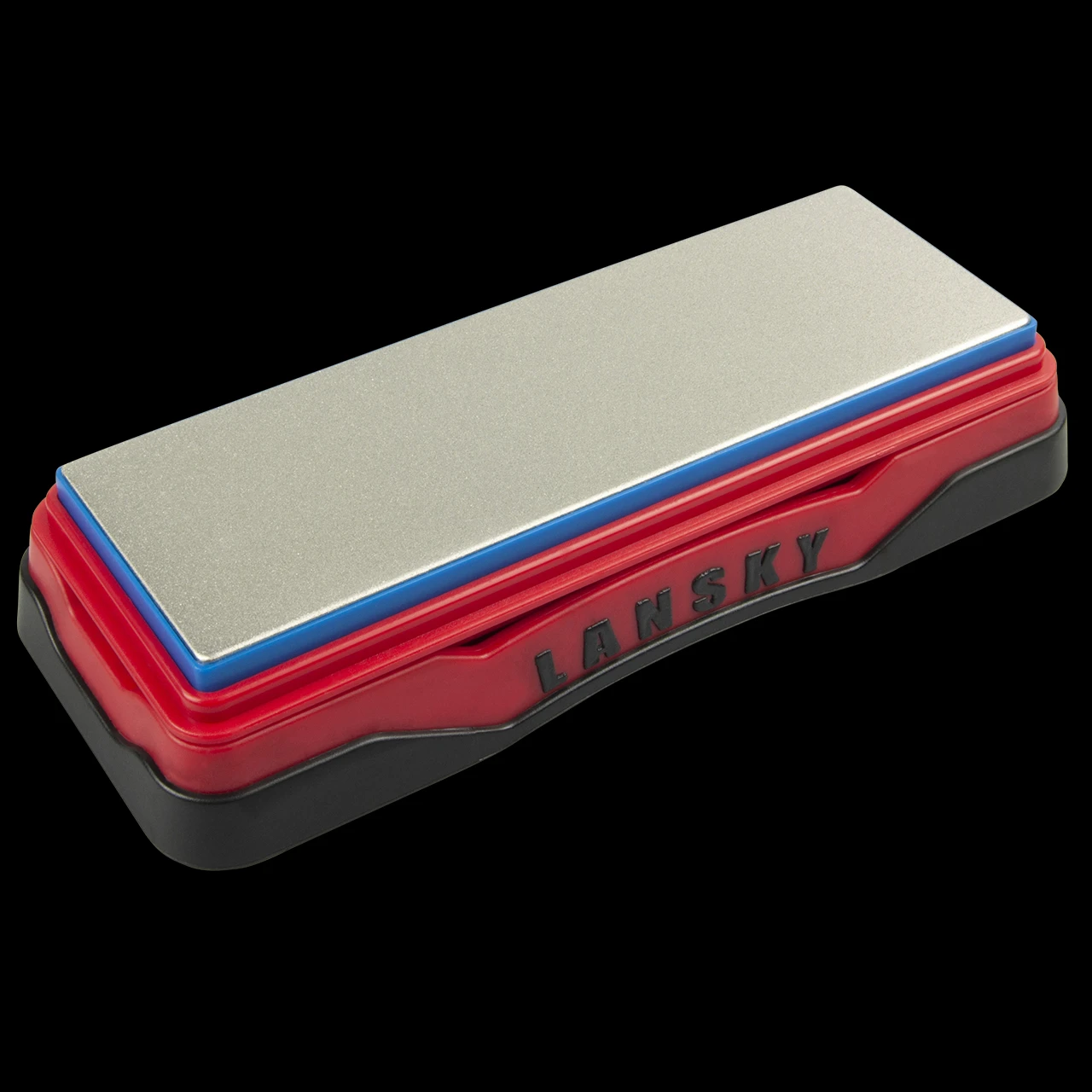 Lansky’s Diamond Bench Stones feature a high-impact plastic self-storing case that raises the stone as shown to the left for maximum safety and comfort. The base comes with non-slip rubber frame.