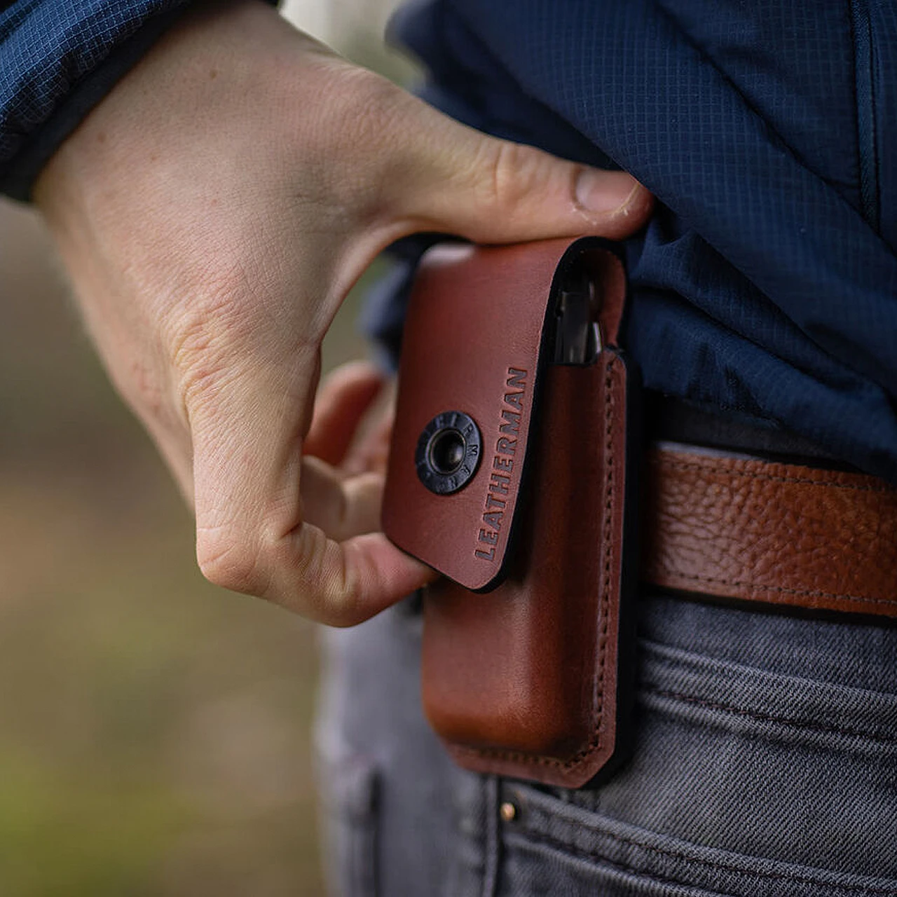 The Leatherman Ainsworth leather sheath is constructed from vegetable tanned top grain drum-dyed cowhide. This gives you a premium leather that ages with character over time.