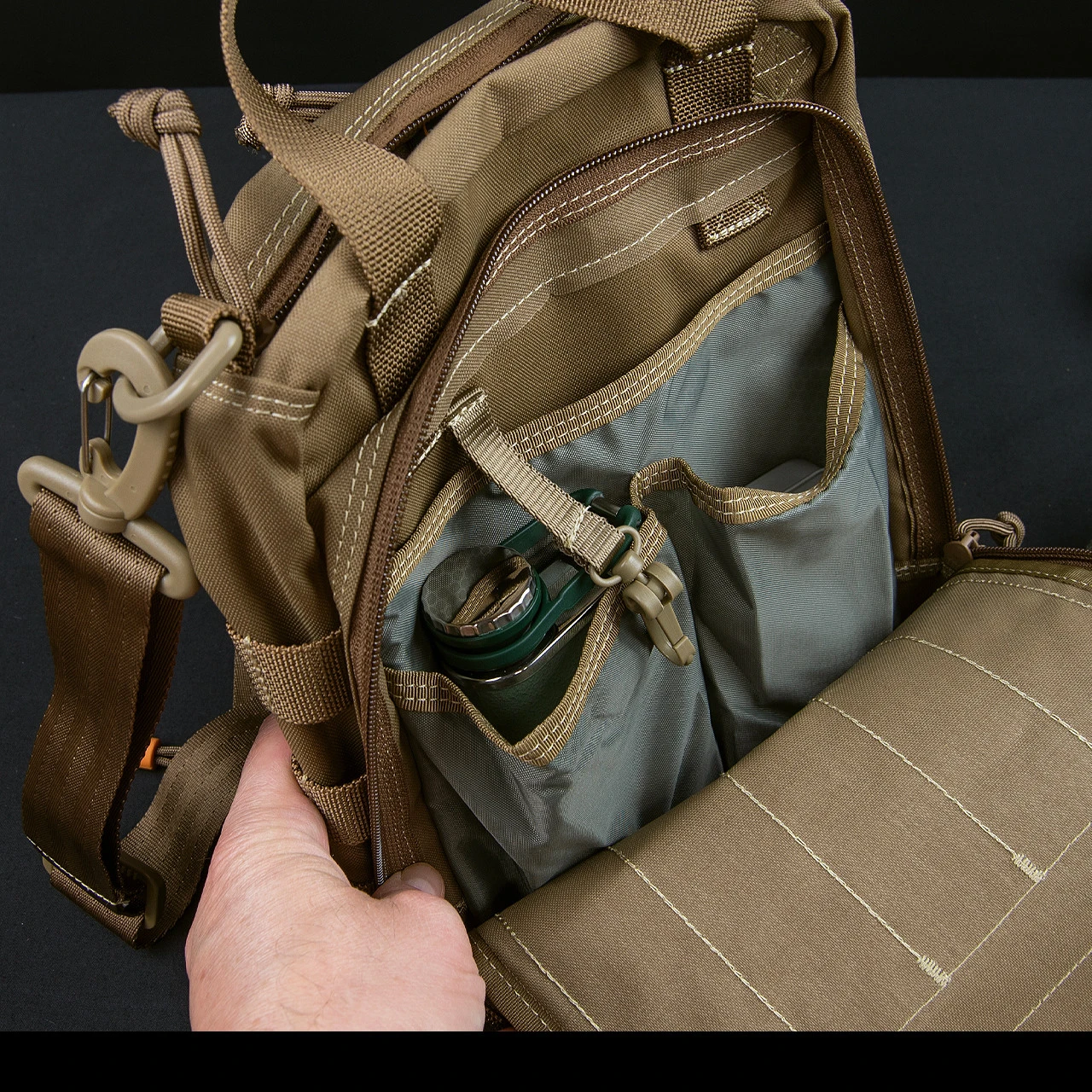 The main section has both sides as a hook and loop surface to add pouches and pockets to organise your stuff one of which is zippered. One outer has a MOLLE panel to attach your carabiners and tusk tools with an inner for books and keys. The other side has four elasticated loops for your flashlight, knife or multi-tool