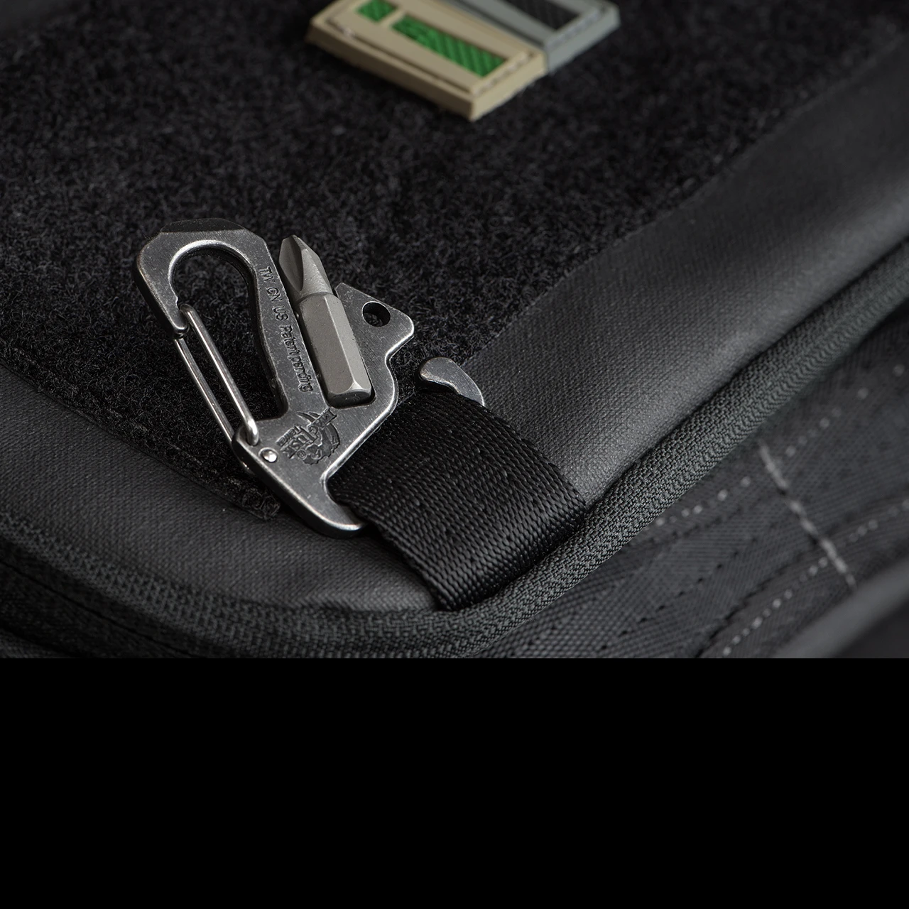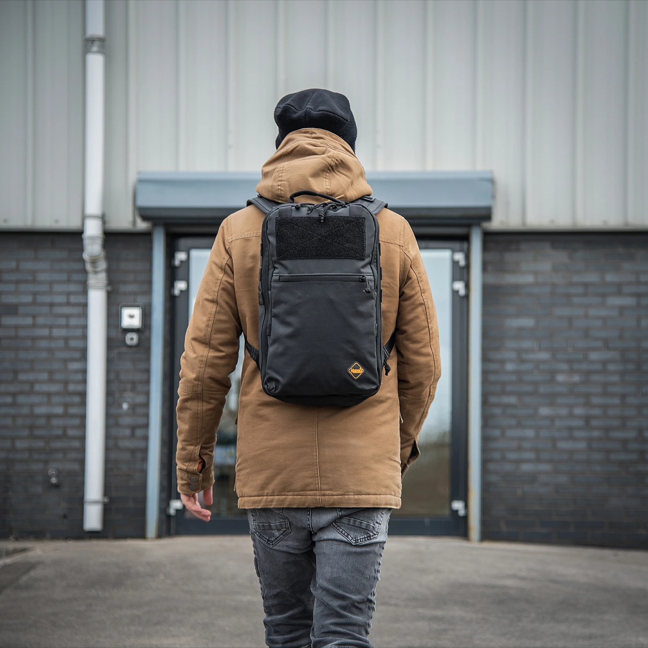 The 500 Denier material is waterproof and extremely tough. The slimline but roomy interior is perfectly suited to books, folders and a laptop/iPad (the rear section is padded to protect fragile items). The main compartment features a zippered web pocket, a section to add pouches and pockets and a large sleeve for you iPad. The front section has one large surface for added modular pockets and loops and opens flat to access your EDC items. There is also a front zippered pocket for keys, wallet and vital documents.