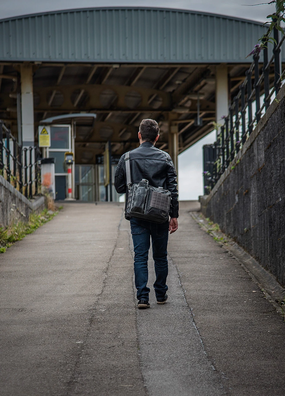 It is supplied with a detachable strap and can be worn on either side of the body and with either side facing outwards. One side features two zippered pockets, a bottle holder compartment with elasticated loops and a wider pocket with MOLLE panel and three internal sleeves. The main compartment has two hook and loop surfaces and a padded laptop sleeve measuring 30 x 26cm. The rear zippered sleeve has a hook and loop surface and two separate sleeves this area is ideal for folders, books etc.