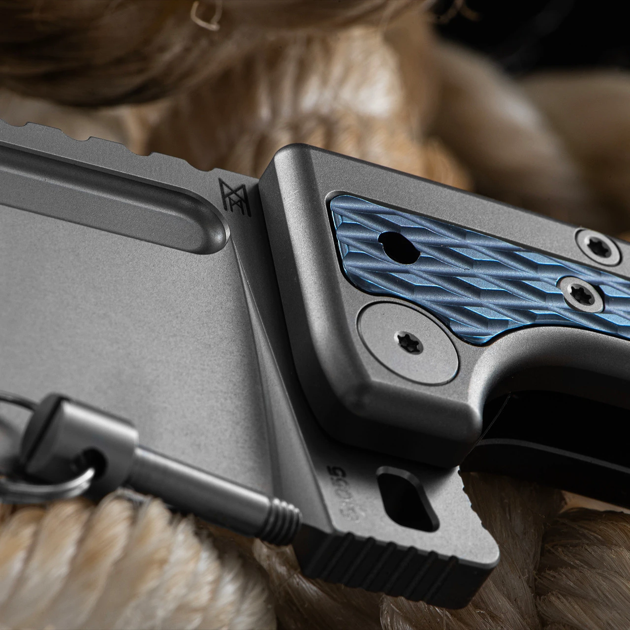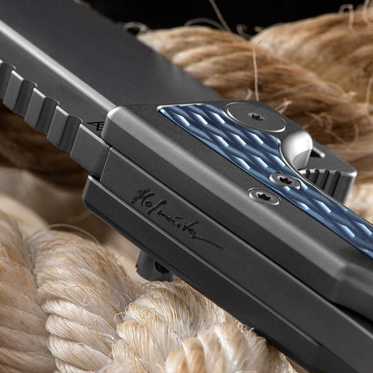 The hefty D2 blade measures 8.2cm, with a full-length fuller groove, and is set off to perfection in a titanium handle, with blue anodised titanium accents. The one-sided titanium pocket clip is engraved to compliment the pattern on the handle scales, and the back spacer, also in titanium, is engraved with the Hoffmeister signature.