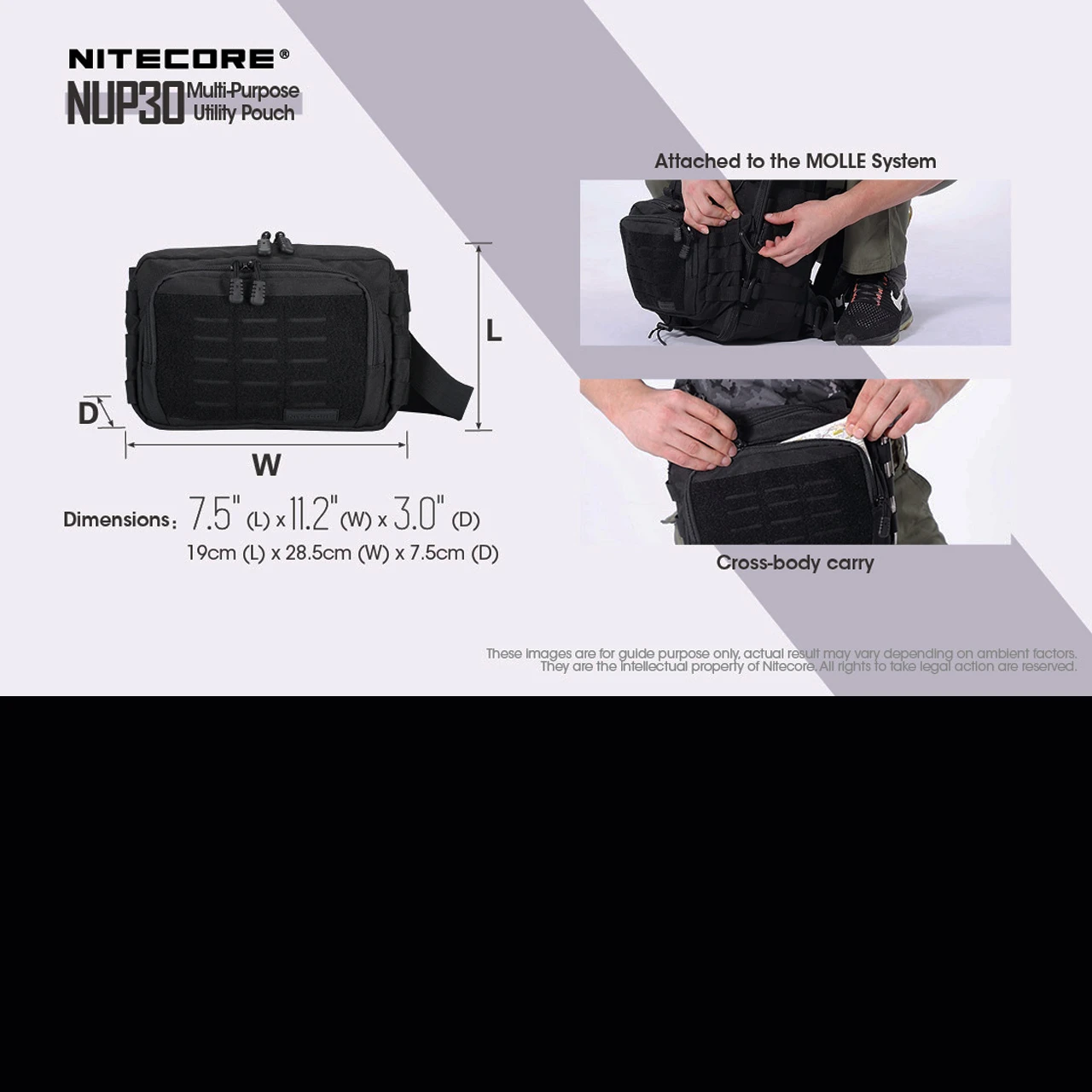 The Nitecore NUP30 is low profile utility pouch which can be used either independently or for modular expansion to a larger bag, such as the Nitecore BP25 backpack. It is made from black 600D polyester fabric with a dirt and water resistant coating.