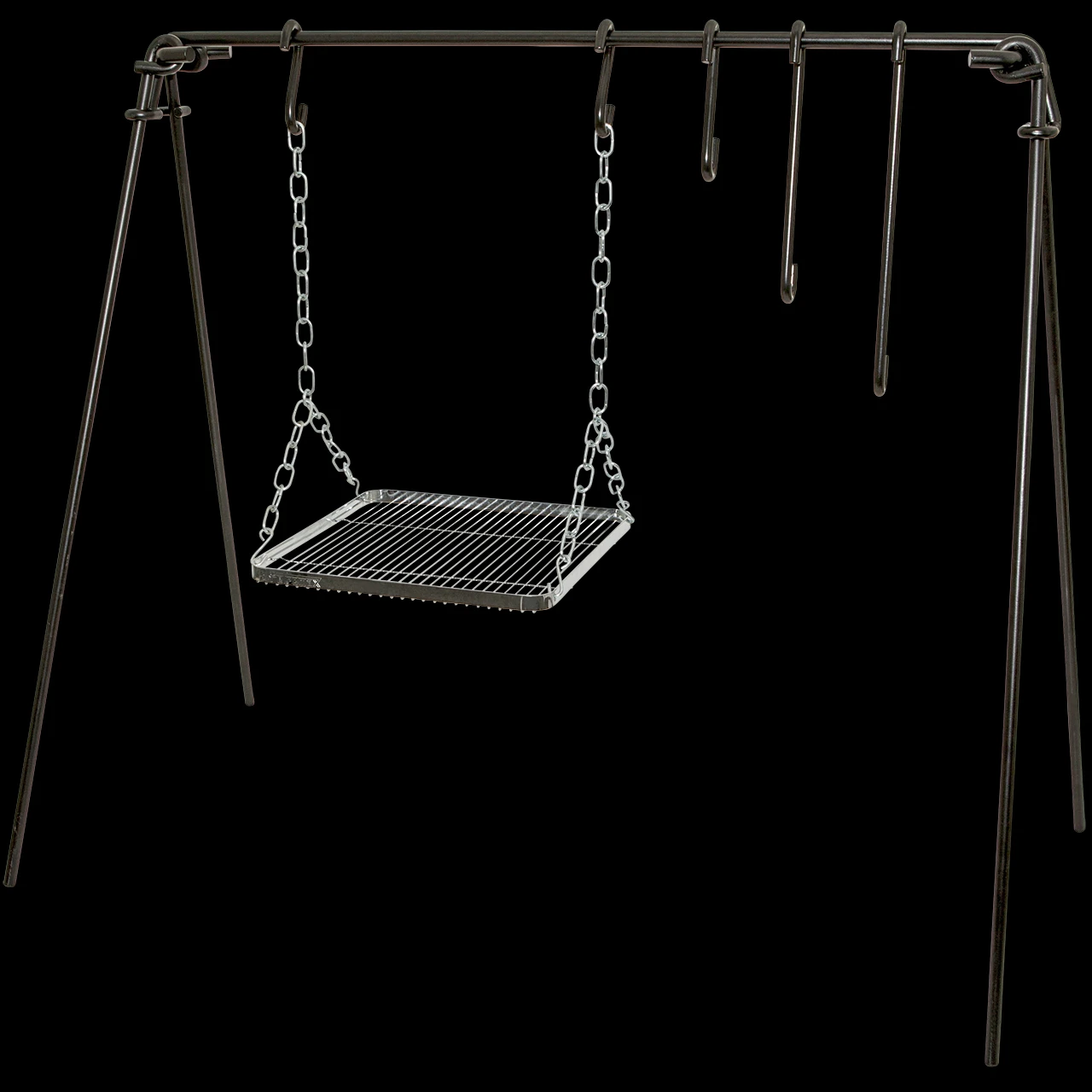 The frame made of coated steel takes your outdoor cooking experience to a new level: suspend pots, pans, kettles and percolators from three hooks over the fire. At the same time, the grilling grate can be raised or lowered, enabling you to roast meat, vegetable skewers etc. as well as to keep prepared dishes hot.