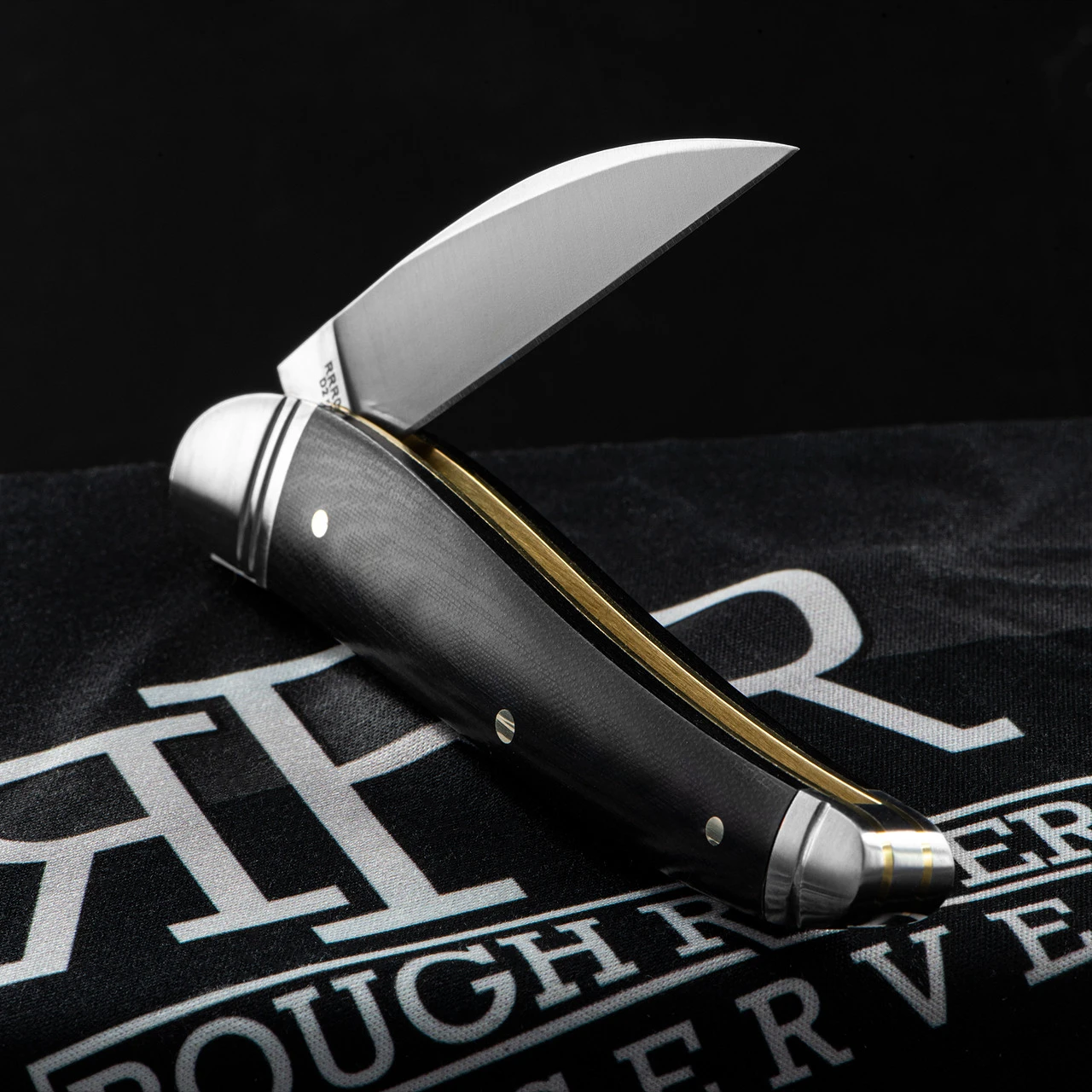 The Rough Ryder Reserve Quillcliffe features a D2 tool steel blade with a satin finish and a match strike pull. The handles are black micarta with stainless steel bolsters, brass liners, and a nickel silver shield. It’s a handsome, stylish folder with many quality features. It is also UK friendly carry due to its non-locking, sub three inch blade.