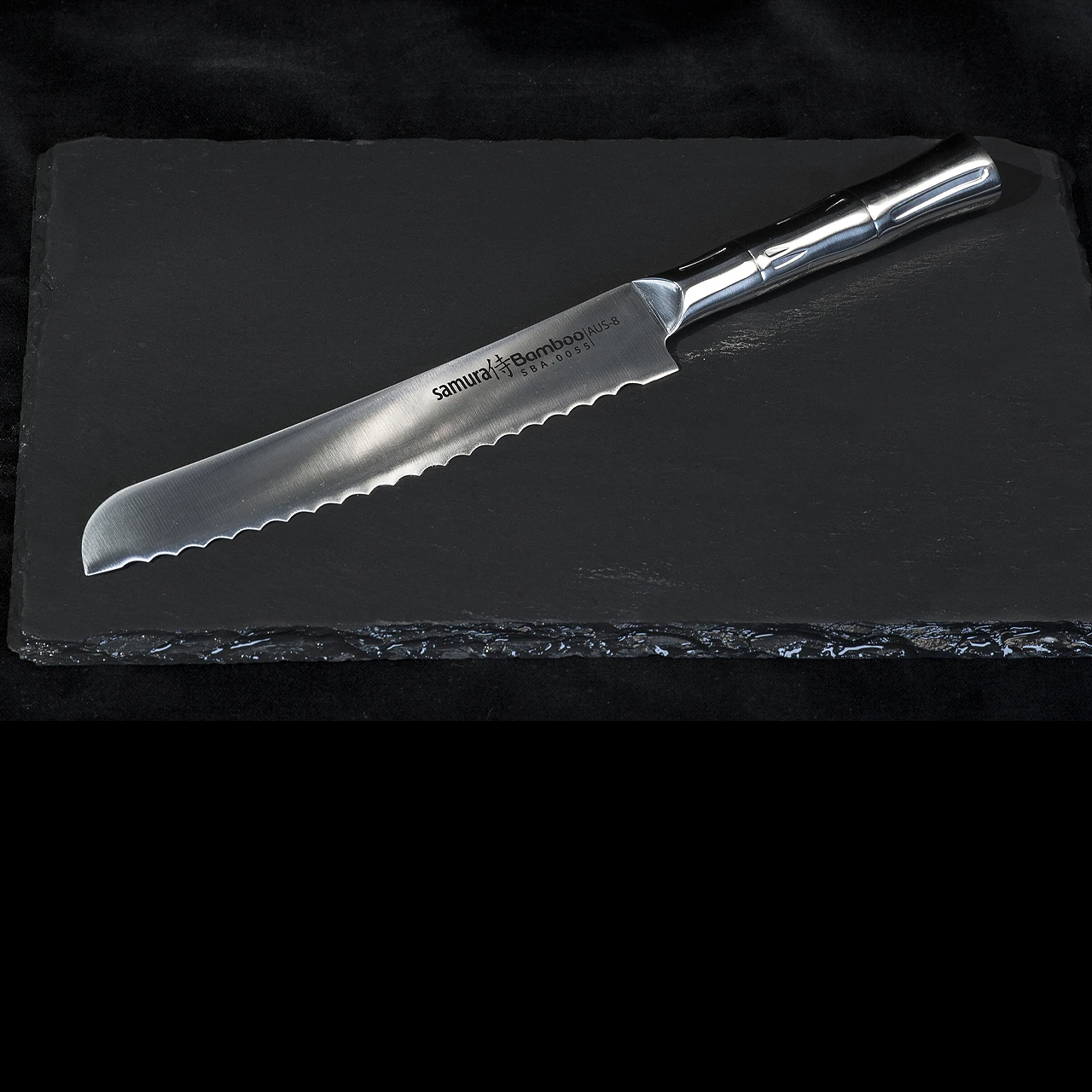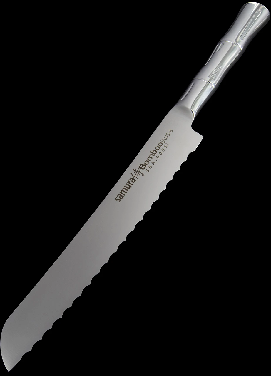 The serrated blade of the Samura Bread Knife Bamboo is, of course, purely utilitarian. As well as slicing easily through your bloomer, baguette or batch loaf, this knife is equally at home with foods having a soft or juicy core, but a hard crust or skin, including pastry, citrus fruits, pineapple, watermelon, etc. Undulating and very sharp teeth delicately saw the crust or skin, without crushing or crumbling the tender core.