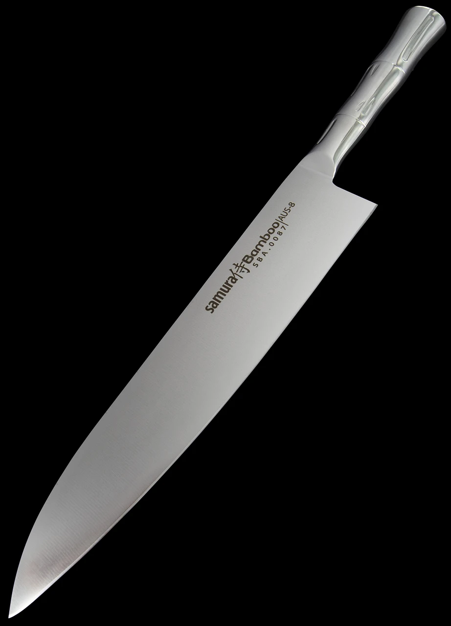 The Samura Grand Chef’s Knife Bamboo has a 24cm, AUS8 stainless blade and a stainless bamboo decorated handle which will grace any kitchen both professional or domestic. Among the most versatile of knives, this is the one you’ll use every day for a wide range of operations, such as chopping, slicing, shredding, dicing and mincing. The steel hardness of 61 HRC makes it possible to deal with even the tenderest material easily.
