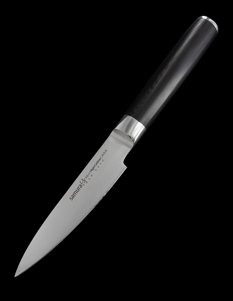 This Samura MO-V Paring knife is considered the smallest of all kitchen knives when it comes to size, but by no means in terms of significance. It is one of the most demanded knives and has become an indispensable element of the classic “cook’s threesome”. It is designed for peeling and slicing small vegetables and fruits, and its short narrow blade is able to cope splendidly well with this task. With a very light (only 73 grams), compact and ergonomic non-slip oval handle, the vegetable knife is maximally adapted even for quite a lengthy manipulation.