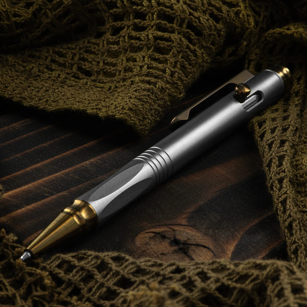 The main body of the pen is Titanium with very attractive bronze anodised tip, pocket clip, bolt action button and butt cap. The writing end has been carefully sculpted on both the body and nib to enhance the writing experience. Custom springs ensure a smooth bolt action engagement that is not too stiff. Finally, Spartan Blades have used a Schmidt Technology easy FLOW 9000 M pressurized cartridge for writing in any situation.