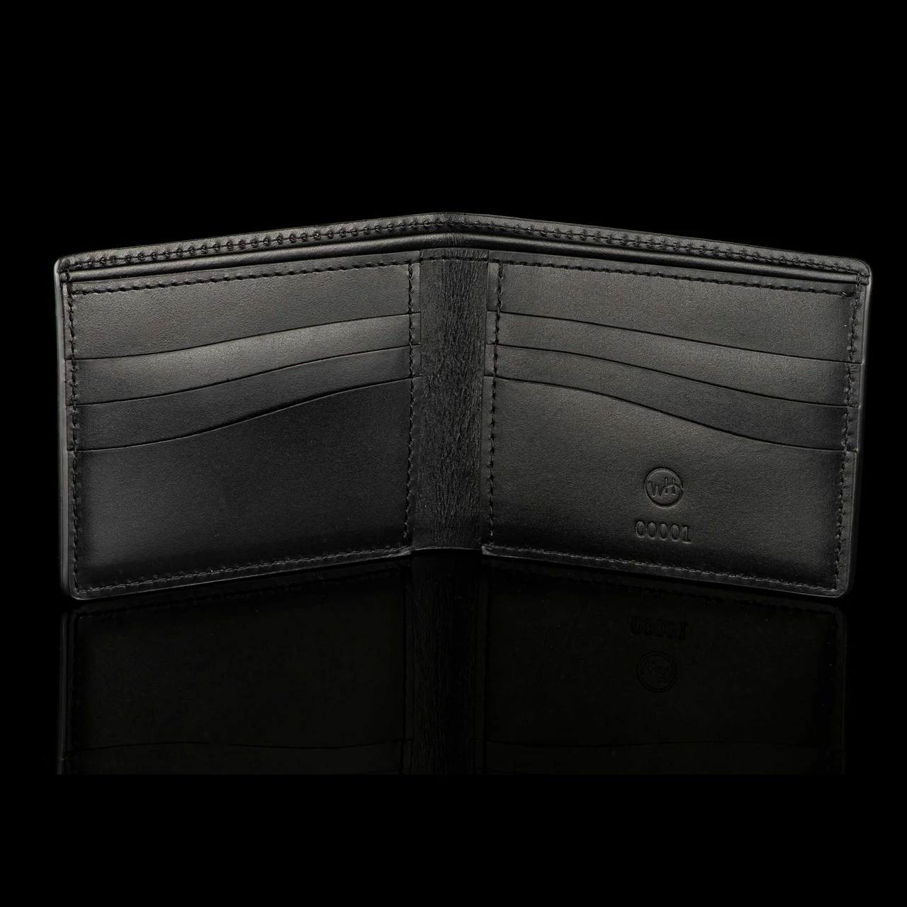 William Henry’s Midnight Bi-fold Wallet is beautifully crafted from premium farm raised lizard skin on the exterior, and supple black harness leather on the inside.