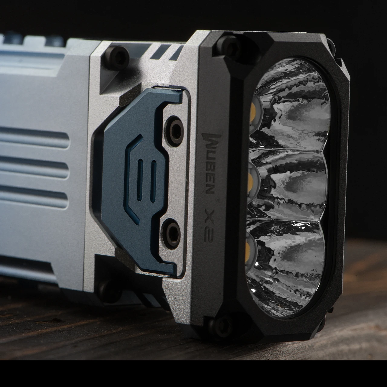 The Wuben X2 is a chunky powerhouse of a lighting tool! Three OSRAM P9 LEDs deliver a blinding 2,500 lumen light and a 1000 lumen strobe. It is so powerful that the 2,500 lumen output produces so much heat the system has to drop to 800 lumens to prevent overheating. After a couple of seconds it is ready to go again.